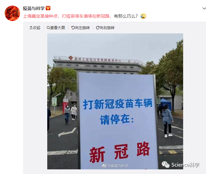近日,上海嘉定有条马路“火”出圈,名叫“新冠路”。“上海嘉定某接种点,打疫苗停车请停在新冠路,有那么巧么?”近日,有博主晒出一张照片,引发网友围观。据了解,该照片拍摄于嘉定工业区的一个新冠疫苗临时接种点,大家都在大门口竖着的引导牌前,驻足拍照,打卡留念。