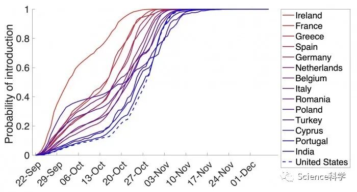 研究人员通过对来自15个国家的数据的分析估算出英国游客在2020年9月22日至12月7日期间将这种变体带到15个国家的几率。他们发现,到11月中旬,几乎可以肯定,这种病毒变种已经在所有15个国家出现。在美国,变种可能在10月中旬就已经到达。