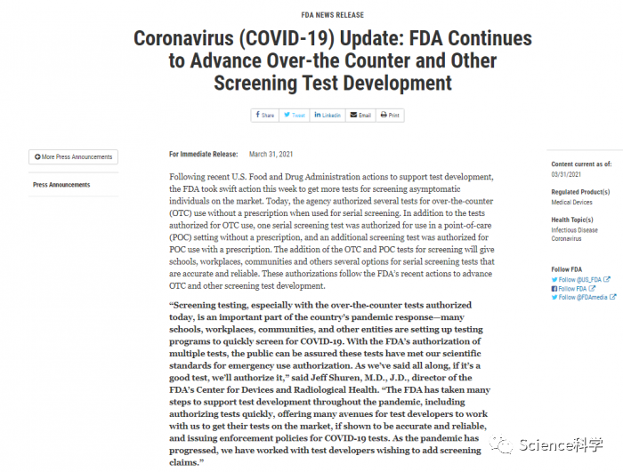 筛查检测,尤其是今天授权的非处方检测,是国家大流行病反应的重要组成部分,许多学校、工作场所、社区和其他实体正在建立检测程序,以快速筛查COVID-19。随着FDA对多项检测的授权,公众可以放心,这些检测已经达到了我们的科学标准,获得了紧急使用授权。正如我们一直说的,如果是好的检测,我们就会授权。