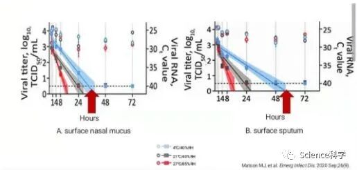 鼻黏液、痰液表面的新冠病毒在相对湿度40%、4℃和21℃条件下,可存活36小时和48小时。