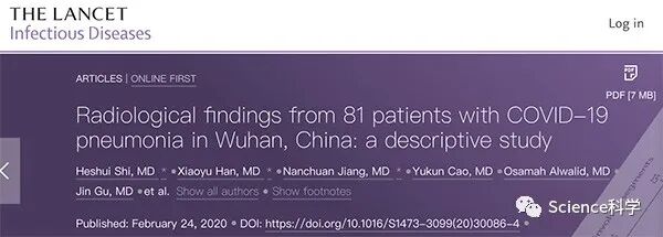 病毒核酸检测无疑是确诊新冠状肺炎的“金标准”,不过肺部疾病诊断治疗中非常关键的CT在这场疫情中也同样发挥着巨大作用。当地时间2月24日,《柳叶刀》(The Lancet)子刊《柳叶刀-传染病》(Lancet Infectious Diseases)在线发表了华中科技大学同济医学院附属协和医院放射科和武汉市金银潭医院放射科联合团队的研究论文“武汉81例新冠肺炎的影像学表现:一项描述性研究”。