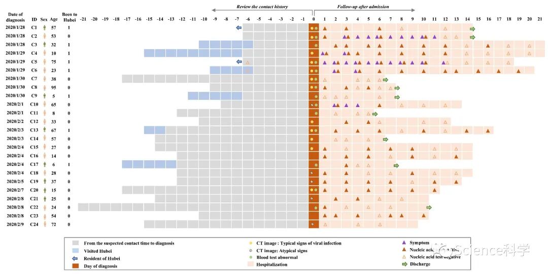 截至2020年2月18日,这24例病例均未出现严重肺炎,仅5例在住院期间表现出典型症状。与此前的研究相似,发烧、咳嗽和疲劳是主要症状。先前代表着疾病严重程度的淋巴细胞减少和白细胞减少在本研究的无症状病例中并不常见。