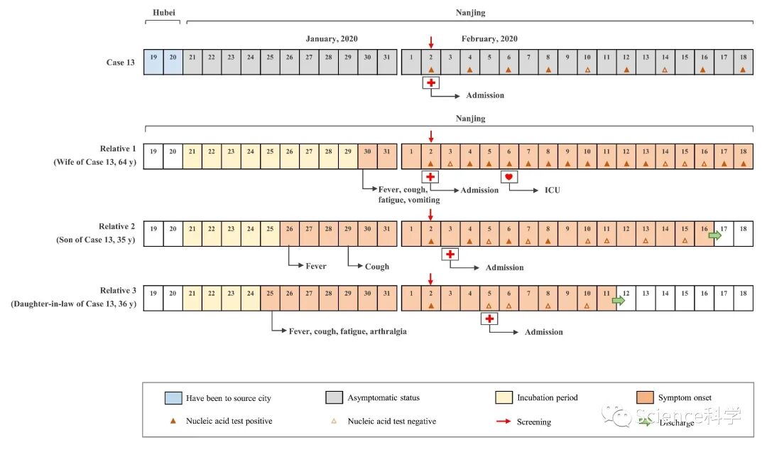 特别是病例13无症状感染者,直到2020年2月18日仍对新冠病毒呈阳性,这表明传染期可能长达29天(从2020年1月21日至2月18日)。
