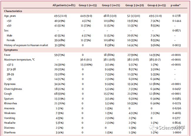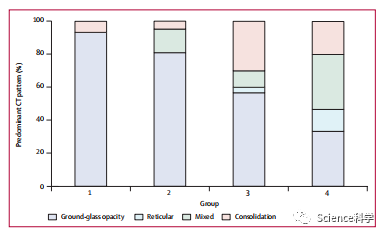 根据症状发作时间与第一次 CT 扫描之间的间隔,81 例于 2019 年 12 月 20 日-2020 年 1 月 23 日期间入院的患者共分为 4 组:第 1 组 15 例(亚临床患者)、第 2 组 21 例(≤ 1周)、第 3 组 30 例(1-2 周)、第 4 组 15 例(2-3 周)。