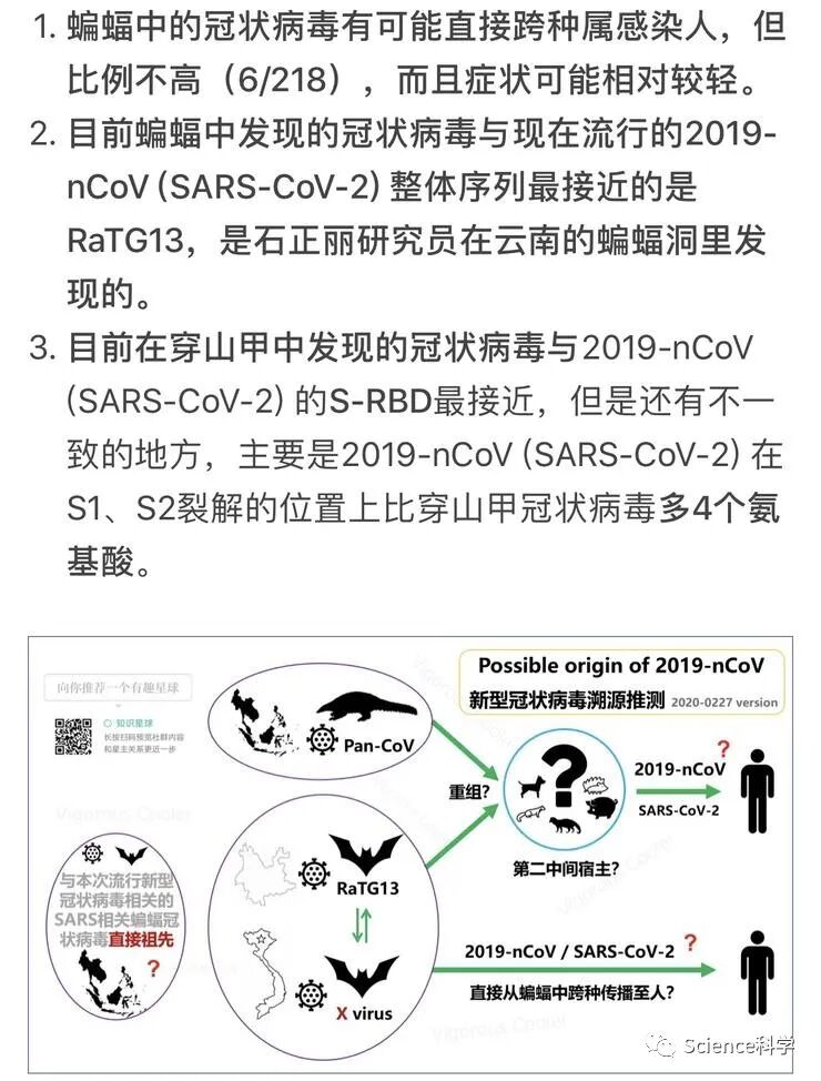 基于此,当前还存在一种“病毒重组”的说法——主要包括两个推论,一是中间宿主中发生了蝙蝠携带的冠状病毒和马来亚穿山甲携带的冠状病毒的重组,二是蝙蝠冠状病毒直接感染人。