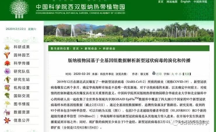2020 年 2 月 20 日,中国科学院西双版纳热带植物园通过官网发布研究成果信息称,武汉华南海鲜市场的新型冠状病毒是从其他地方传入的 ,推论该市场不是病毒发源地。