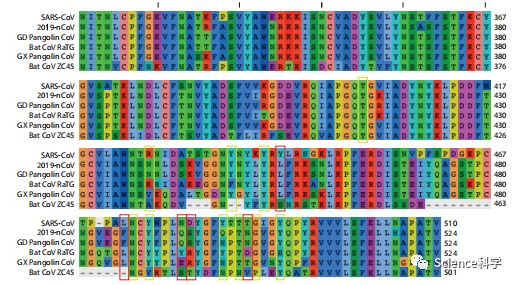 2020 年 2 月 18 日,香港大学管轶团队与广西医科大学胡艳玲团队的论文在预印本网站 bioRxiv 上发表。管轶等人对三批马来亚穿山甲样本进行了分析与研究,发现新冠病毒与马来亚穿山甲冠状病毒的受体结合域的氨基酸序列相似度高达 97.4%。同时,马来亚穿山甲冠状病毒和新冠病毒在病毒受体区域的 5 个关键残基(如下图红框部分)上共享氨基酸。