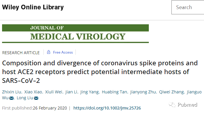 2月26日,湖北医药学院附属人民医院的刘龙联合广州暨南大学吴建国课题组在《医学病毒学杂志》上发表论文称,龟类(西部锦龟、绿海龟、中华鳖)也可能是将新冠病毒传播给人类的潜在中间宿主。