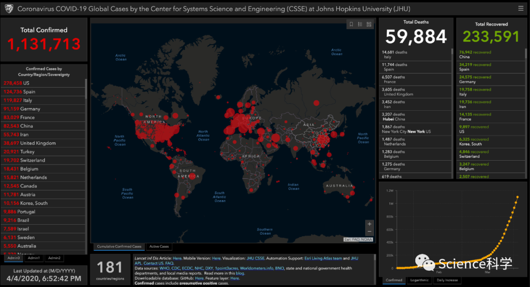 2020年4月4日19时50分数据,全球疫情实况跟踪展示板该可视化展示板由(Johns Hopkins)约翰·霍普金斯大学系统科学与工程中心的团队建立,主要用于描述2019-nCov冠状病毒在中国及全球其他地区的传播情况,并会根据来自WHO、CDC等来源的数据定期更新。访问链接:https://arcg.is/0fHmTX