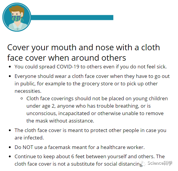 美CDC同时指出,民众即便佩戴者口罩,也至少要与他人保持至少6英尺(1.82米)的安全距离,避免集体聚会,只有在户外运动和采购生活必需品时才能外出,回家后要勤洗手。