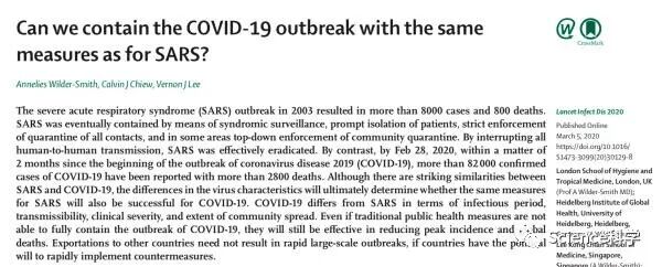 当地时间3月5日,顶级医学期刊《柳叶刀》(The Lancet)子刊《柳叶刀-传染病》(The Lancet Infectious Diseases)以“个人观点”(Personal View)的形式在线发表了“我们能否以对付SARS的相同措施控制COVID-19?”。