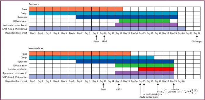 这项研究首次描述了新冠肺炎进展的全貌。幸存者的发烧中位时间约为12天,与非幸存者相似。但是幸存者的咳嗽可能会持续很长时间,45%的幸存者在出院后仍会咳嗽。在幸存者中,呼吸困难(呼吸急促)将在约13天后停止,但会持续到非幸存者死亡。这项研究还说明了发生不同并发症的时间,如败血症,急性呼吸窘迫综合征(ARDS),急性心脏损伤,急性肾脏损伤和继发感染。