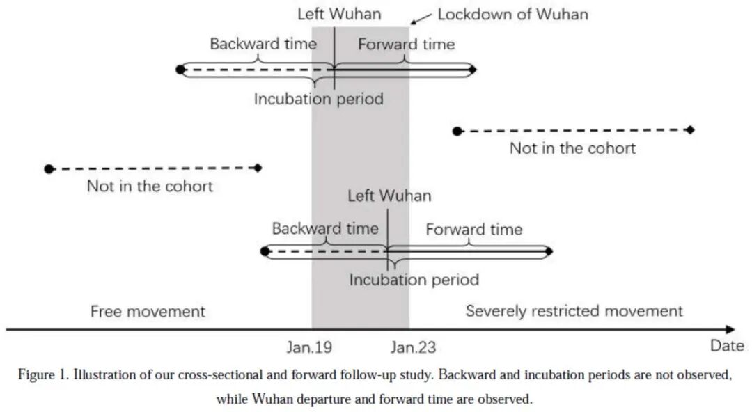 研究团队通过搜索公开数据,确定了在离开武汉时无症状的个体,然后对其进行跟踪直至他们出现症状。通过横断面研究(cross-sectional study)与前瞻性随访研究(forward follow-up study),团队将患者从离开武汉到症状发作之间的时间视为正向复发时间,将病毒潜伏期视为一个更新过程(renewal process)。