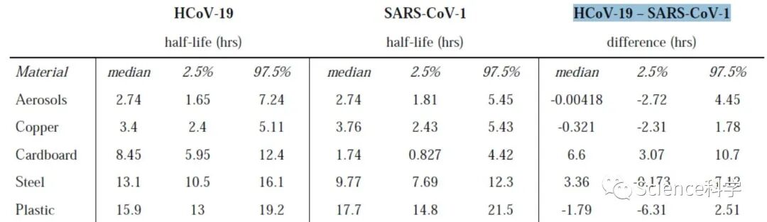 新冠病毒和SARS冠状病毒在气溶胶中表现出相似的半衰期,中位估计值均约为2.7小时,新冠病毒半衰期的95%可信区间为1.65-7.24 小时;SARS病毒则为1.81-5.45小时。