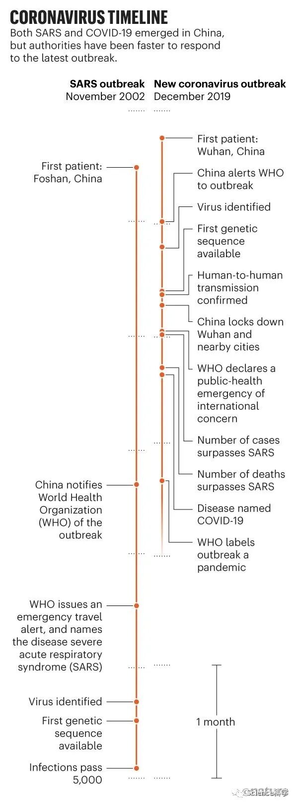 从一开始,COVID-19就被拿来与2002-03年爆发的SARS作比较,两者具有很多相似之处。首先,它们都属于冠状病毒大家族;其次它们都是最早在在中国爆发;最后,SARS被认为是通过蝙蝠传染给果子狸,然后再从果子狸传染给人,而COVID-19也被认为是从蝙蝠通过一些中间宿主再传给人。