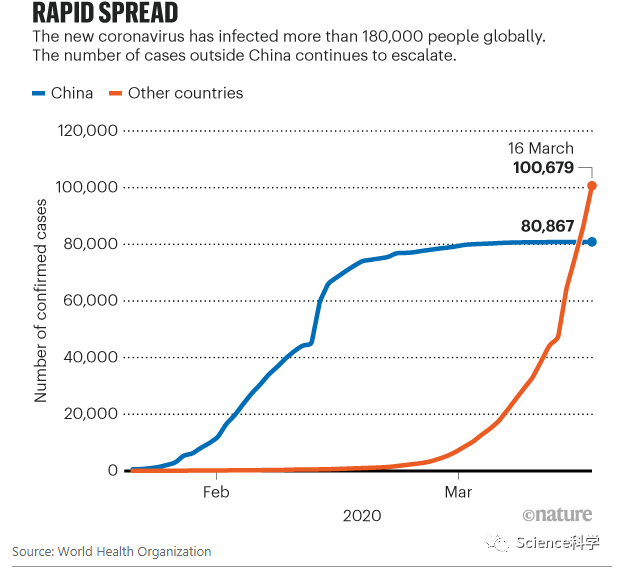 3月18日,权威期刊杂志《自然》封面杂志刊文梳理新冠病毒事件,通过五张图,从病毒的传播、发表的论文数量、死亡率等,揭示了新冠疫情爆发对全球的影响。