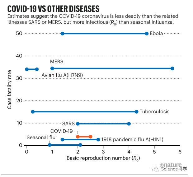 目前对COVID-19(新冠肺炎)死亡率(新冠肺炎死亡人数占确诊人数的比例)的评估表明,新冠病毒导致的死亡率远低于其他大规模疫情,如SARS、MERS(中东呼吸综合征)和埃博拉病毒。