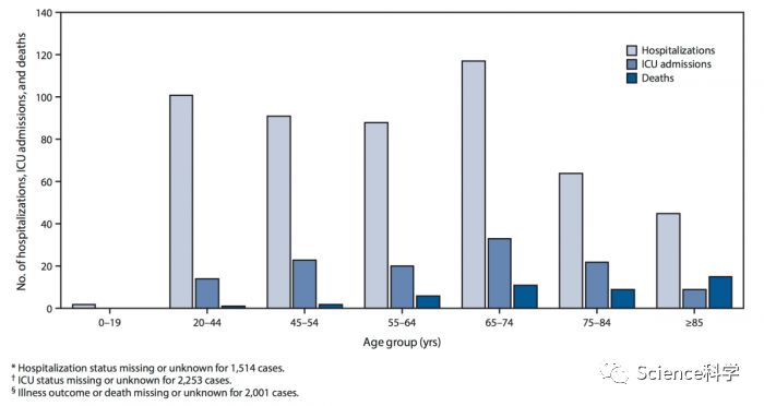 迄今为止,CDC报告中的数据反映了在其他国家(例如中国)的情况,在65岁以上人群中,住院和死亡人数最高。CDC在报告中指出:“总体上,年龄≥65岁的成年人中,有31%的确诊病例,45%的住院治疗,53%的ICU入院率和80%的死亡;而在≥85岁的成年人中,重症的发生率最高。”