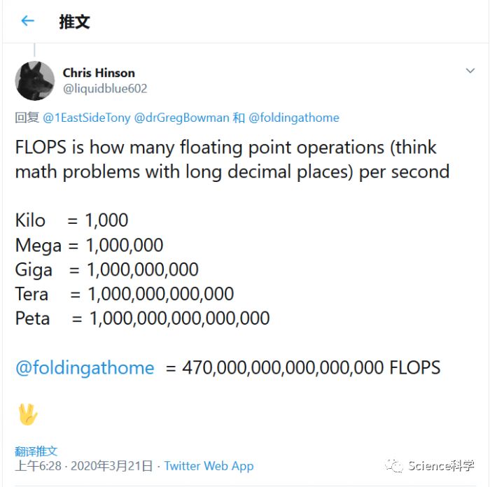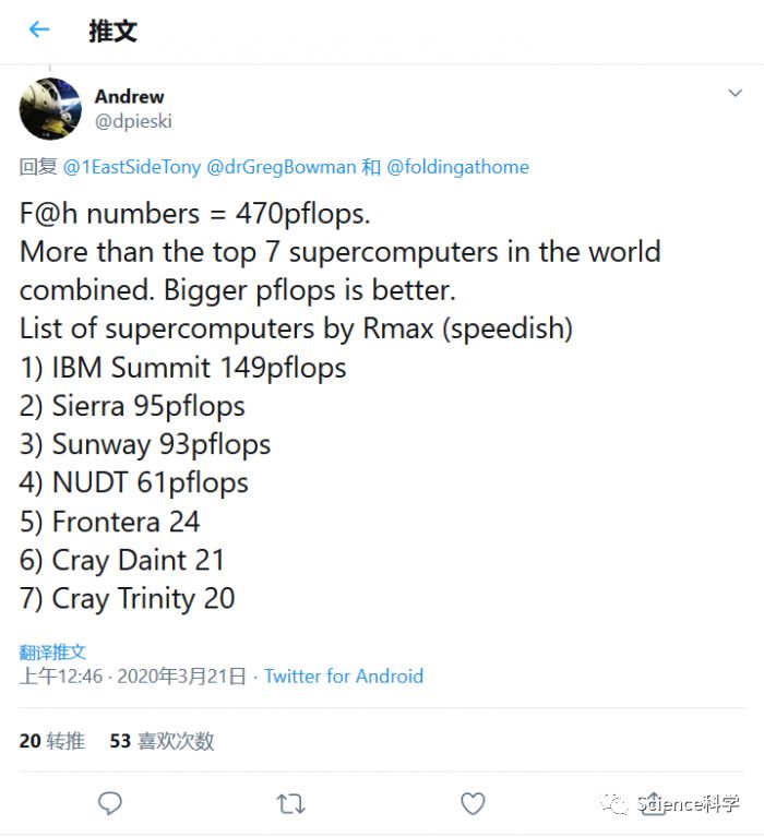 如果你对这个数字并没有直观的概念,那么我们来做个对比。Summit的峰值计算为200 petaFLOPS,而LINPACK基准测试为148.6 petaFLOPS。也就是说当前Folding@home项目计算能力是该超级计算机的两倍多。