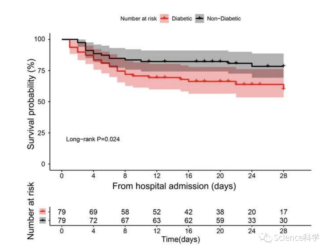 论文数据显示,在823名COVID-19确诊患者中,有79名(9.6%)是糖尿病患者。中位年龄为66岁(IQR,56.0-73.3)。糖尿病患者和匹配的非糖尿病患者的死亡率分别为35.4%和20.3%。