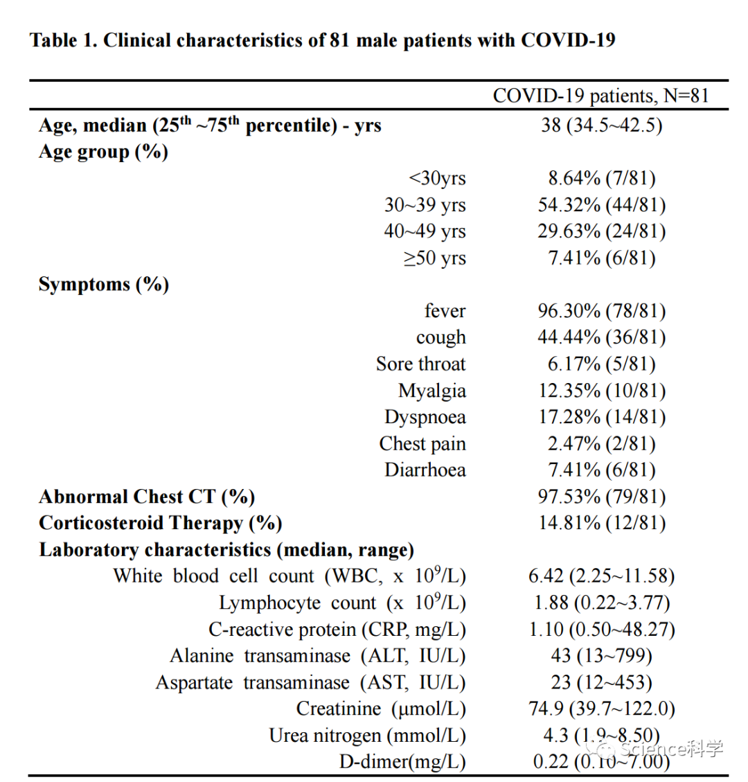 武汉大学中南医院生殖医学中心的这个团队对81名男性新冠患者的血清样本进行了回顾性研究。他们于3月5日在3月18日期间入住武汉雷神山医院,年龄从20至54不等(中位数38岁)。