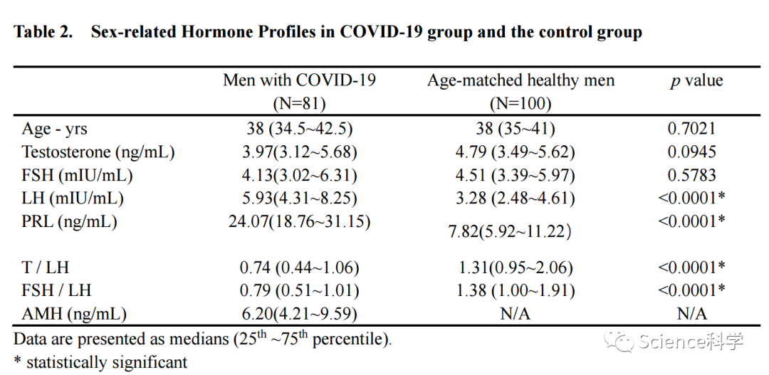 与对照组相比,新冠患者的黄体生成素和催乳素水平显著升高,睾酮和卵泡刺激素相对黄体生成素的比值则显著降低。