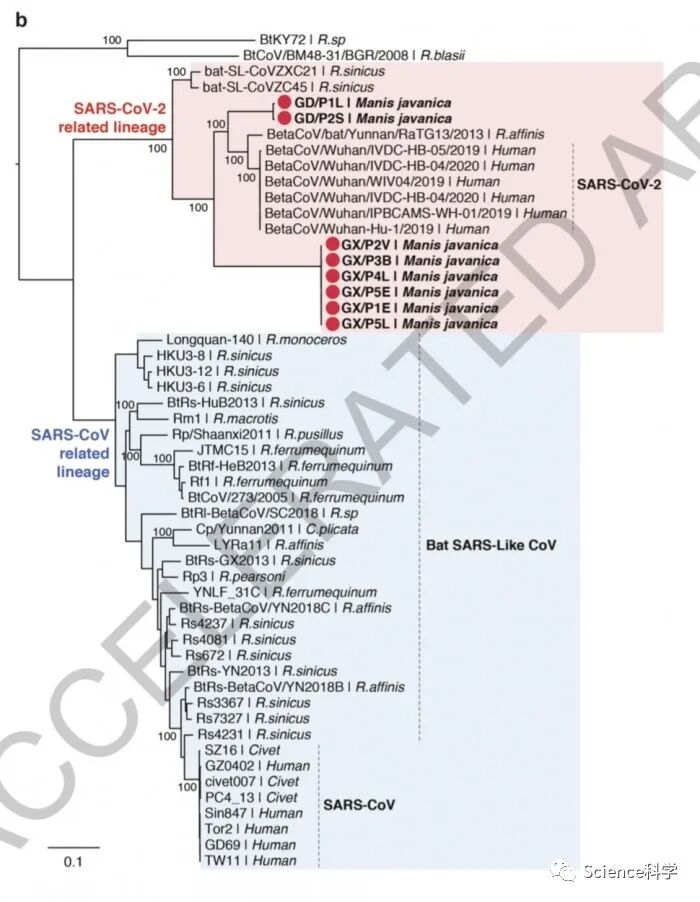 在此次这项最新研究中,管轶等人报告了在中国南部反走私行动中查获的穿山甲(哺乳纲鳞甲目)中发现了新冠病毒相关的冠状病毒。他们发现,穿山甲相关的冠状病毒属于新冠病毒相关冠状病毒的两个亚型,其中一个亚型的受体结合域与新冠病毒非常接近。
