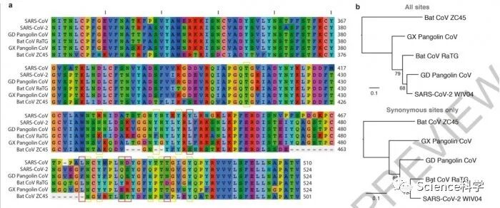 事实上,广东穿山甲冠状病毒和新冠病毒在RBD的5个关键残基上拥有相同的氨基酸,而RaTG13和新冠病毒只有一个氨基酸相同。然而,只针对RBD的同义位点系统发育分析显示,广东穿山甲冠状病毒并非新冠病毒的最接近亲缘关系。