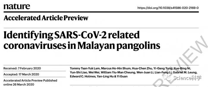 围绕新冠病毒起源的问题在科学界仍然是个迷。当地时间3月26日,顶级学术期刊《自然》(Nature)在线发表论文“Identifying SARS-CoV-2 related coronaviruses in Malayan pangolins ”。该项研究通讯作者为香港大学公共卫生学院新发传染病国家重点实验室管轶教授、广西医科大学胡艳玲教授。值得注意的是,该成果是以“加快评审文章”(Accelerated ArticlePreview)的形式上线,接收时间为当地时间3月17日。