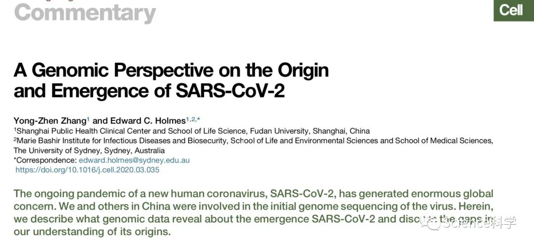 上述推测结论来自两位病毒学专家:澳大利亚悉尼大学玛丽·巴希尔传染病和生物安全研究所的爱德华·霍尔姆斯(Edward C. Holmes)教授,以及中国疾控中心(CDC)传染病预防控制所研究员、复旦大学附属上海市公共卫生临床中心兼职教授张永振。当地时间3月26日,这两位“老搭档”联合在顶级学术期刊《细胞》(CELL)上发表了一篇评论“A Genomic Perspective on the Origin and Emergence of SARS-CoV-2”。
