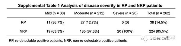 该研究中选取了从2020年1月23日至2月25日陆续出院的共计262例COVID-19患者,将其入组以分析其临床参数。复阳(RP)和非复阳(NRP)患者根据住院期间的疾病严重程度进行分组,并分析再次入院时的临床特征。研究者使用了高灵敏度检测方法检测了新冠病毒RNA和血浆抗体水平。