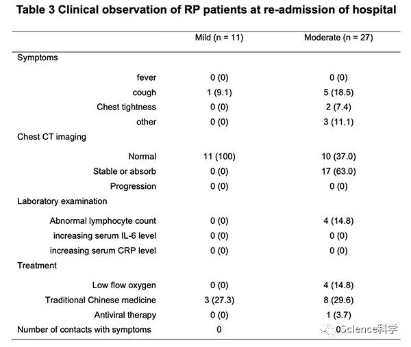 所有38例复阳患者均重新入院接受进一步医学观察。分析表明,所有这些患者均未发烧。少数患者报告了轻度的咳嗽和胸闷,并没有比以前恶化。