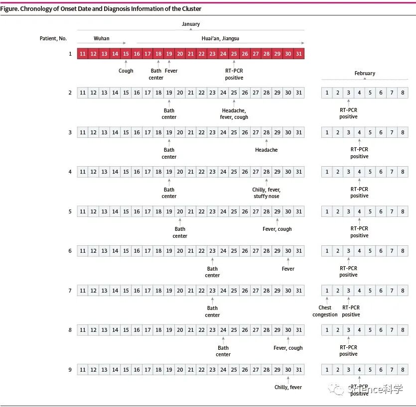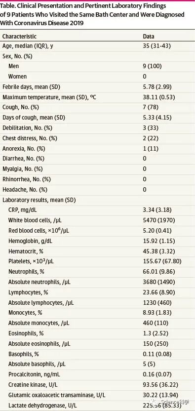 研究人员分析了江苏淮安第四医院于1月25日至2月10日收治的9名男性新冠肺炎确诊患者信息,这9人曾去过同一家洗浴中心。