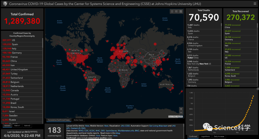 2020年4月6日22时数据,全球疫情实况跟踪展示板该可视化展示板由(Johns Hopkins)约翰·霍普金斯大学系统科学与工程中心的团队建立,主要用于描述2019-nCov冠状病毒在中国及全球其他地区的传播情况,并会根据来自WHO、CDC等来源的数据定期更新。访问链接:https://arcg.is/0fHmTX