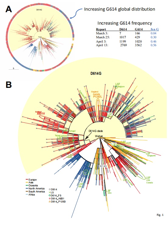 D614G突变毒株当前正在以惊人的速度传播,从最早1月底在德国被发现到遍布欧洲,在任何一个新的地区,它都会在短短几周内成为被引入的主导菌株。这也表明D614G比原始毒株能更迅速地适应当地环境。