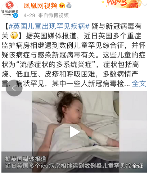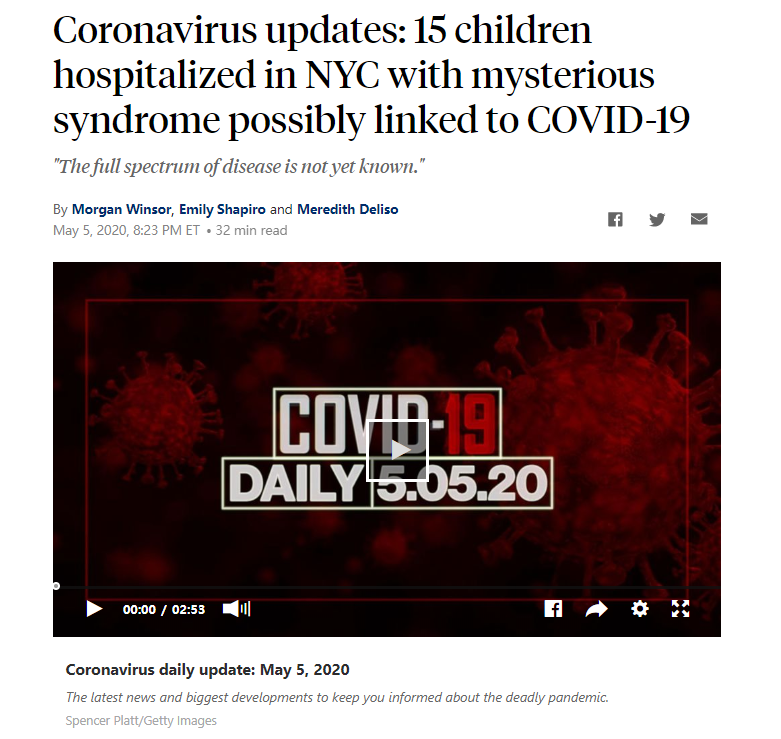 而在5月5日,美国ABC也报道了15名在纽约市住院的儿童患有可能与COVID-19相关的“神秘”综合征。