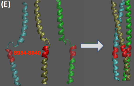 S943P突变与HR1区融合核心处的一簇突变有关,该簇突变位于病毒与宿主细胞膜融合前的穗状蛋白中的HR1螺旋体断裂点。这簇富含Ser-和Thr-的残基很容易形成氢键,可以促进螺旋的形成。这可能更容易促进该区域的构象变化。