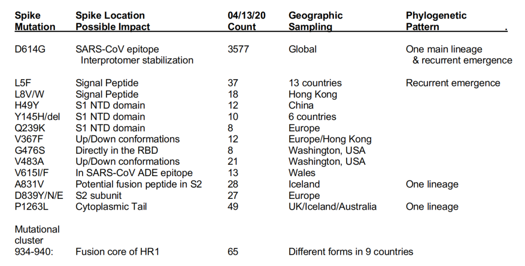 截止2020年4月13日,科研人员已经发现了14种突变和1个聚类突变。在这些突变种,一些突变种类已经逐渐销声匿迹。一些则越来越活跃,频率持续增加。另一些突变表现出了让人难忘的特征,比如出现在系统发育树的多个位点上。而两个最重要的突变——D614G和S943P是我们需要十分注意的。