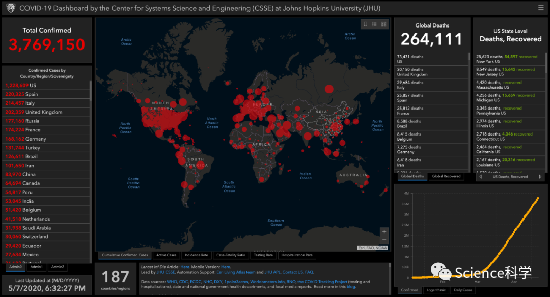 根据约翰·霍普金斯大学(Johns Hopkins University)发布的实时统计数据显示,截至北京时间截至北京时间5月7日18点32分,全球新冠肺炎病例累计确诊3769150例,累计死亡264109例。美国新冠肺炎确诊病例1228609例,死亡73431例,高居全球首位。目前累计感染超过10万的国家有西班牙220325例,死亡25857例。意大利214457例,死亡29684例。英国202359例,死亡30150例。俄罗斯177160例,死亡1625例。法国174224例,死亡25812例。德国168162例,死亡7275例。土耳其131744例,死亡3584例。巴西126611例,死亡8588例。伊朗101650例,死亡6418例。