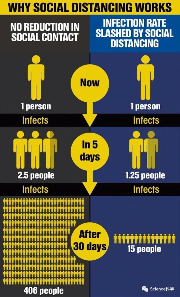 采取“社交隔离”能有效抑制病毒传播(左边为毫无措施传播速度,右边为采取措施传播速度)