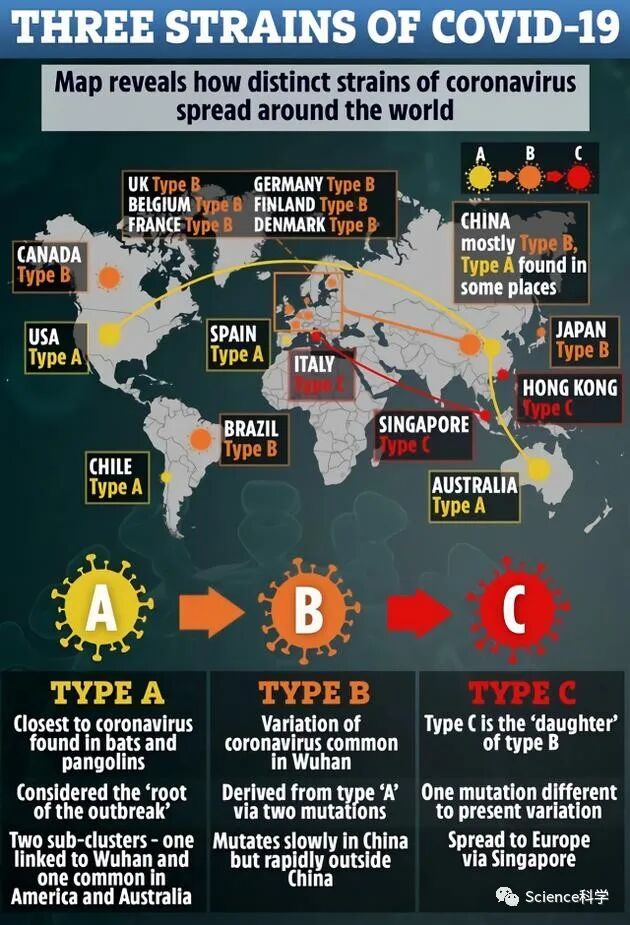 英国科学家研究发现,新型冠状病毒在世界各地传播的过程中变异成了3种不同的毒株,而且“正在快速突变,以适应不同人群中的免疫系统抵抗力”。研究还表明,在一些美国人身上发现的病毒变体与蝙蝠中发现的病毒关系最密切。
