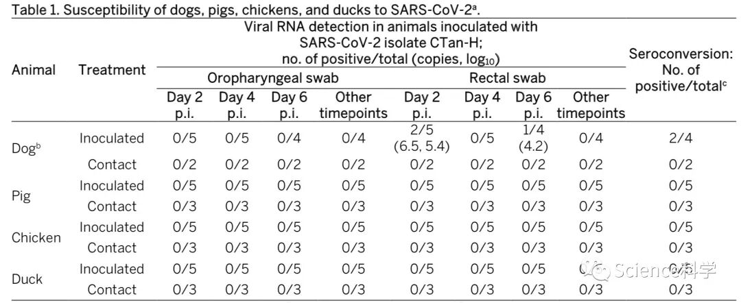 接下来,研究团队同样研究了新冠病毒在狗体内的复制和传播,结果表明,狗对新冠病毒的敏感性较低。类似的研究还表明,猪、鸡和鸭对新冠病毒不易感。