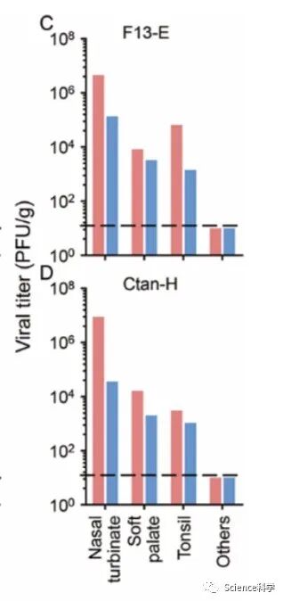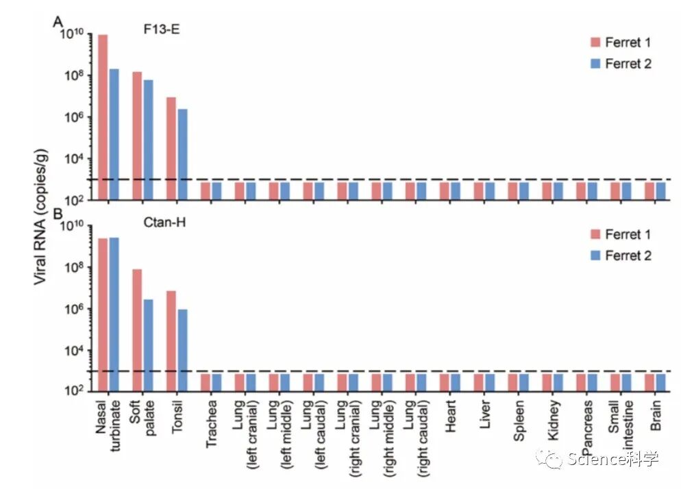 研究团队对雪貂分别经鼻内接种10^5pfu(plaque forming unit)的F13-E或CTan-H,并在接种后第4天实施安乐死(p.i.)。收集每只雪貂的鼻甲、软腭、扁桃体、气管、肺、心脏、脾脏、肾脏、胰腺、小肠、大脑和肝脏,用qPCR和病毒滴定法进行病毒RNA测定。