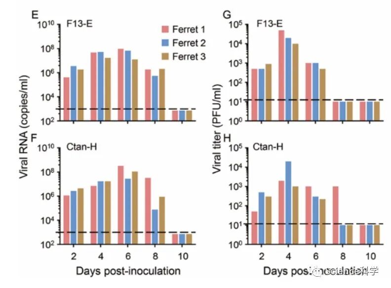 接种F13-E(E)和CTan-H(F)的雪貂洗鼻洗液中的病毒RNA。接种F13-E(G)和CTan-H(H)的雪貂鼻洗液中的病毒滴度。