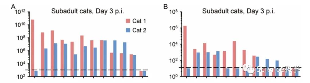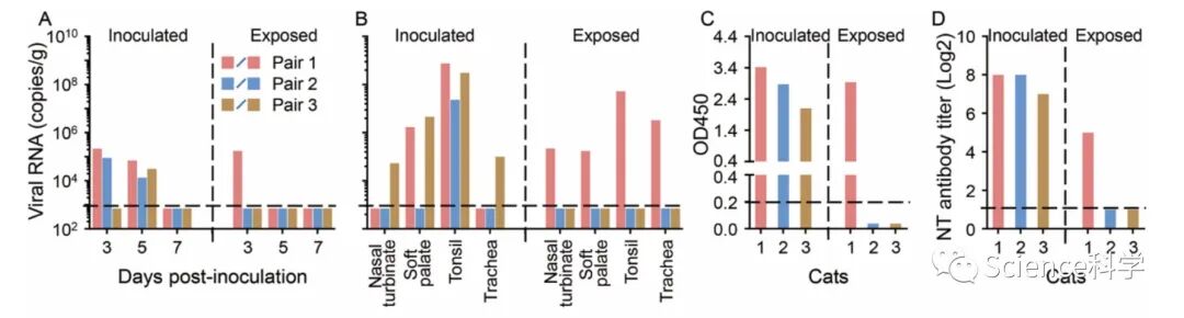 这些结果表明,新冠病毒可以在猫体内有效复制,幼猫更容易被感染。更重要的是,病毒可以通过呼吸道飞沫在猫之间传播。