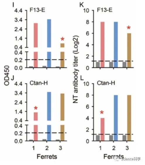 通过ELISA和中和试验,所有雪貂体内均检测到新冠病毒抗体,其中第13天安乐死的两只雪貂的抗体滴度明显低于第20天安乐死的雪貂。