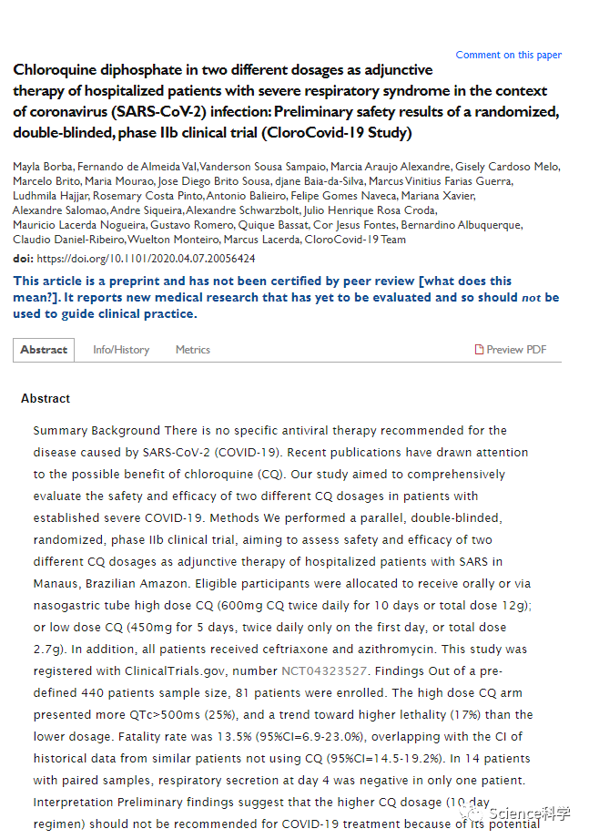 而巴西的研究人员在一项小型研究中遵循了这个程序,但这是因为巴西的COVID-19指南建议使用氯喹。医生们将81人分成两组。其中一组接受了较高剂量的氯喹,而另一组接受了较少剂量的氯喹。所有的人也都接受了阿奇霉素治疗。