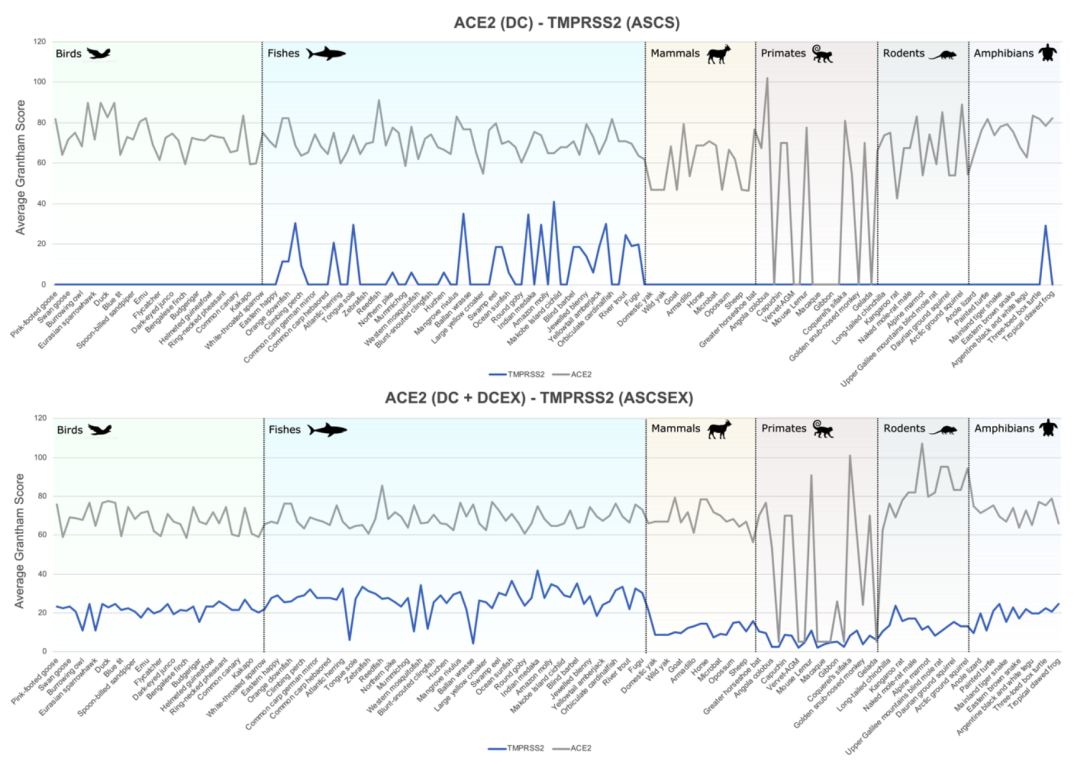 研究团队通过分析215种脊椎动物的刺突蛋白ACE2和TMPRSS2直向同源物与新冠病毒之间的相互作用。在整个脊椎动物直系同源物中,预测突变比TMPRSS2对ACE2的破坏更大。