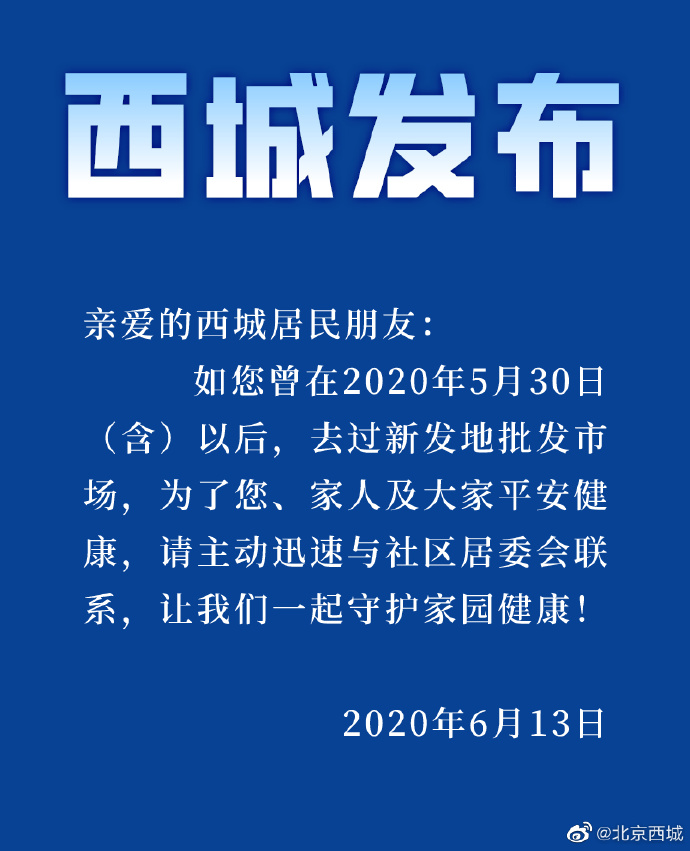 目前丰台区启动战时机制,丰台区已按照“三级响应、二级管控”要求,对新发地周边11小区实施封闭管理,9所学校停课。北京西城区6月13日则给西城居民发的一封公开信表示,在2020年5月30日(含)以后,去过新发地批发市场,请主动迅速与社区居委会联系。