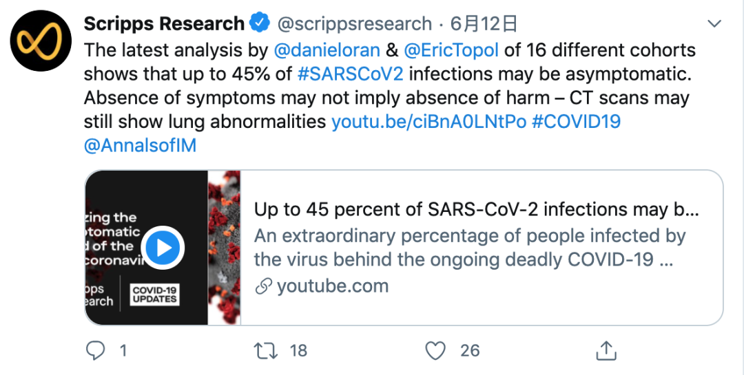 此前,美国斯克利普斯研究所(Scripps Research)转化科学研究院的研究人员对来自全球16个不同组的COVID-19患者的数据进行了回顾综述,以更好地了解有多少例冠状病毒可能源于在不知道自己被感染的情况下传播了这种病毒的人。